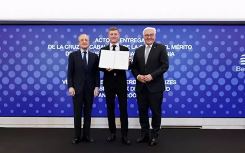 كرم الرئيس الألماني، فرانز فالتر شتاينماير، لاعب منتخب ألمانيا وريال مدريد الإسباني السابق توني كروس، بمنحه وسام الاستحقاق الألماني الاتحادي، وذلك خلال حفل أقيم، الخميس، في ملعب ريال مدريد سانتياجو برنابيو.